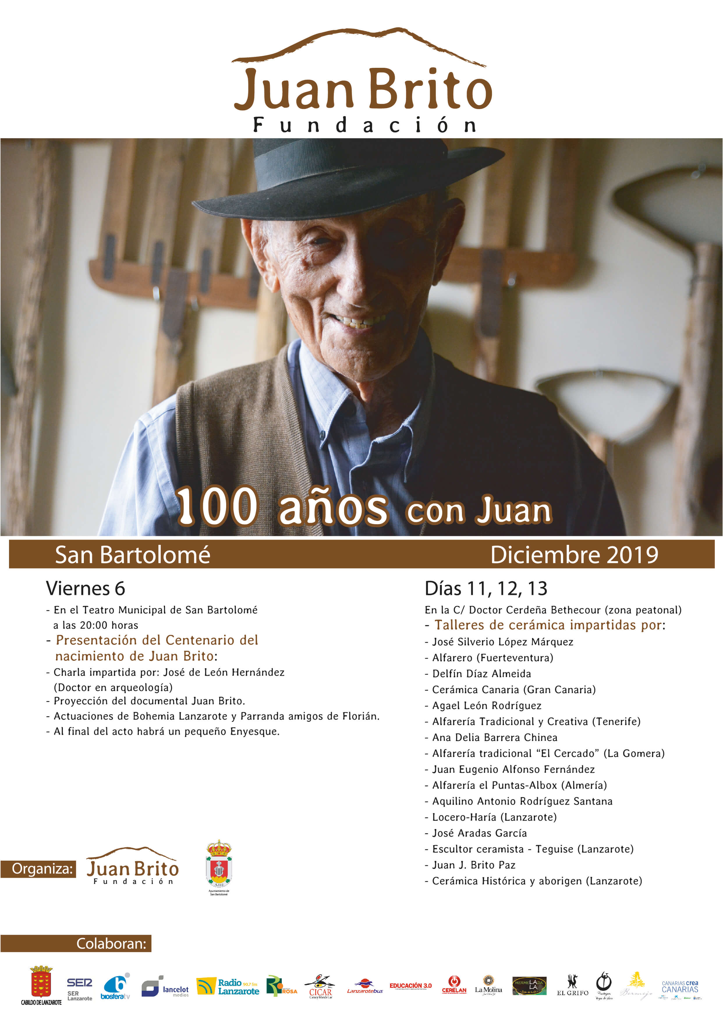 Con motivo de la celebración del centenario de nacimiento de JUAN BRITO, la Fundación Juan Brito, en colaboración con el Ayuntamiento de San Bartolomé ha organizado dos jornadas de talleres de cerámica, previstas para los días 11 y 12 de diciembre en San Bartolomé, de 10:00h. a 13:00h., en la zona peatonal de la Casa Cerdeña.