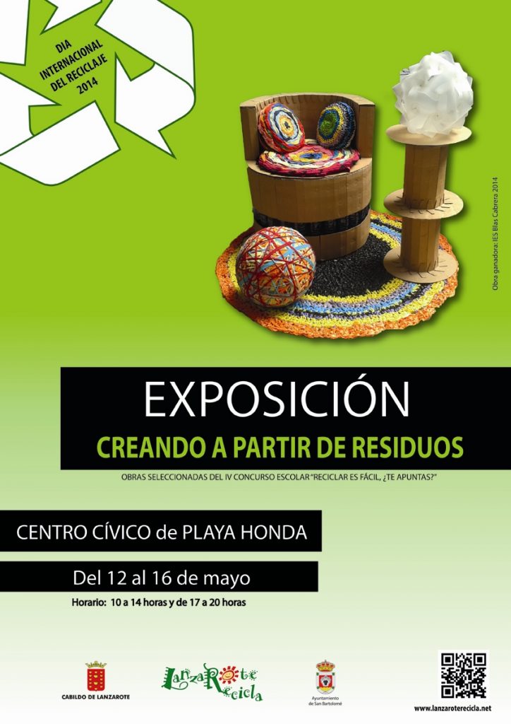 Con motivo del Día Internacional del Reciclaje, el día, 12 de mayo, el Cabildo de Lanzarote, a través de Lanzarote Recicla en colaboración con el Ayuntamiento de San Bartolomé, invitan a la ciudadanía a visitar la exposición “Creando a partir de residuos”, enmarcada dentro del IV concurso escolar “Reciclar es fácil, ¿te apuntas?” que como principal objetivo tiene fomentar la reutilización de los residuos creando objetos útiles y artísticos.