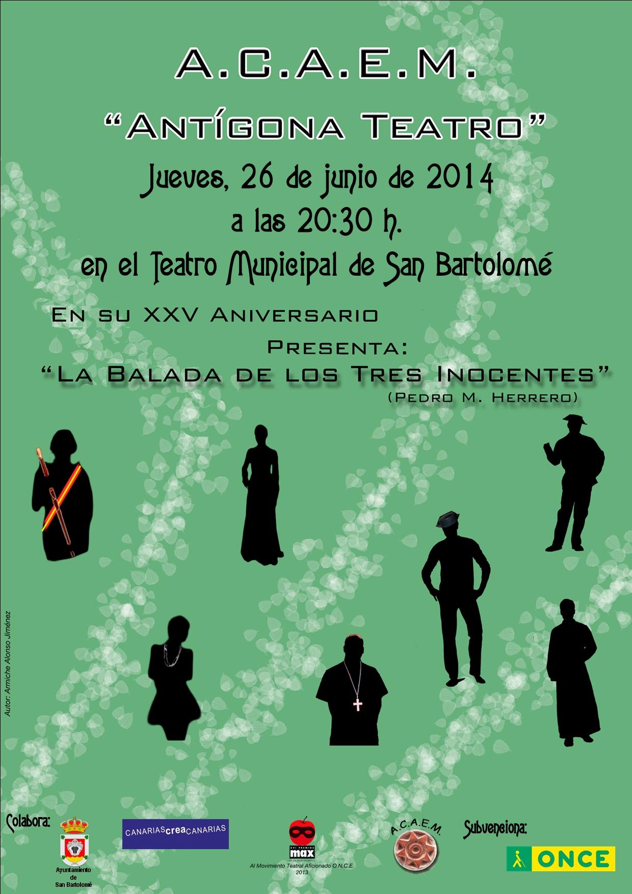 Antígona Teatro presenta La balada de los tres inocentes, una divertida comedia llena de delirantes situaciones. En su gira por Canarias, esta asociación subvencionada por la ONCE, recalarán en San Bartolomé  el jueves 26 de junio, en el Teatro Municipal a las 20:30 h., siendo la entrada gratuita.
