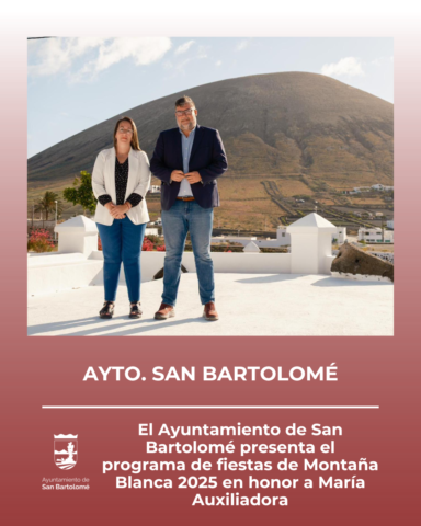 San Bartolomé, 9 de mayo de 2025. El Ayuntamiento de San Bartolomé, a través de la Concejalía de Festejos, presenta el programa de las fiestas de Montaña Blanca en honor a María Auxiliadora, que se celebrarán del 16 al 24 de mayo con una variada agenda de actividades para todos los públicos.
