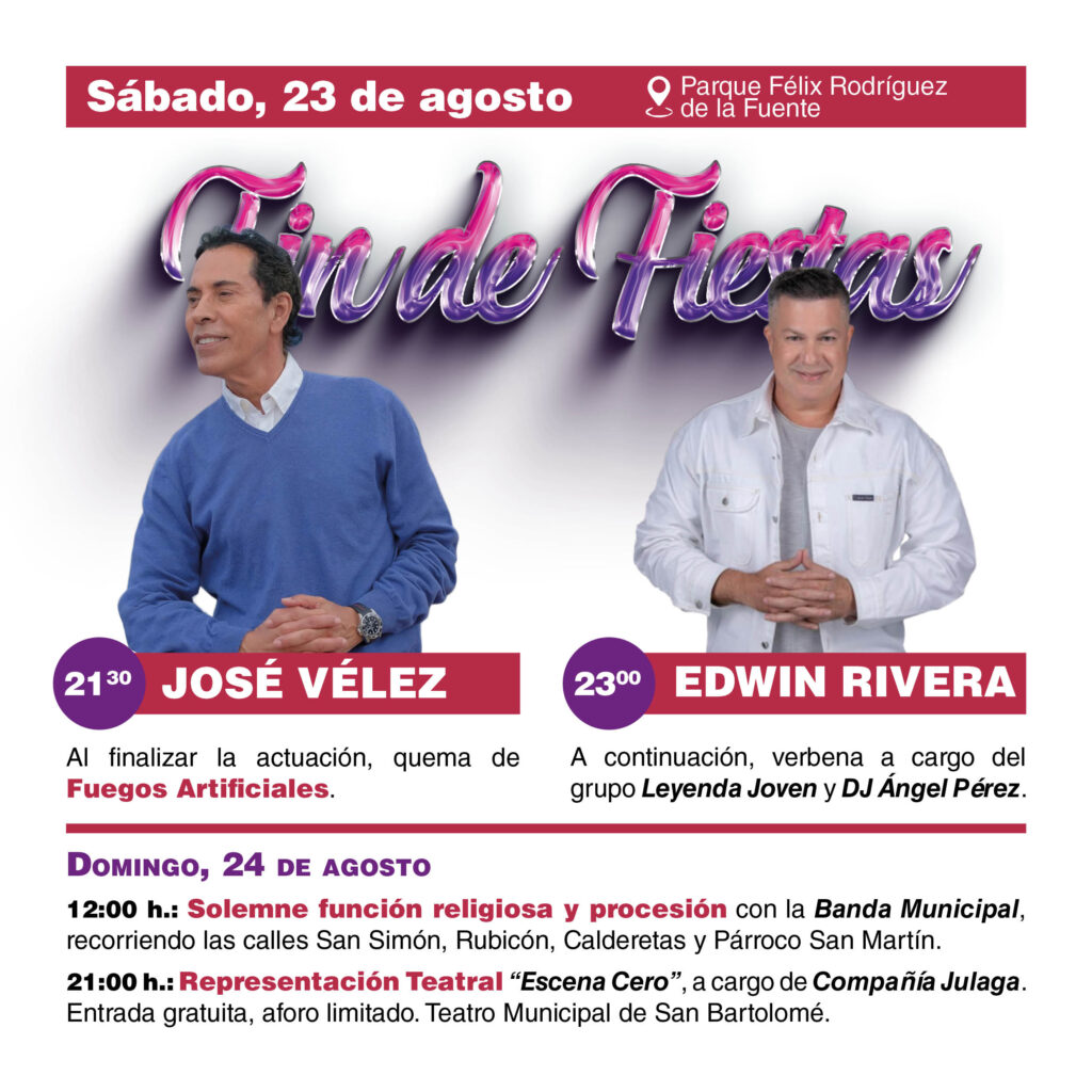 San Bartolomé, 19 de agosto de 2025. El Ayuntamiento de San Bartolomé invita a vecinos, vecinas y población de toda la Isla a los conciertos de José Vélez y Edwin Rivera, las grandes actuaciones que pondrán el broche de oro a las Fiestas patronales del municipio.