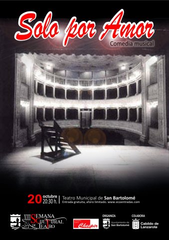 El 20 de octubre a las 20.30 horas el Teatro de San Bartolomé abrirá sus puertas para acoger la representación de la obra teatral “Solo por amor”, a cargo de la Compañía Teatral Chespir, dentro de la programación organizada con motivo de la celebración de la XIII Semana Cultural de Teatro de San Bartolomé.