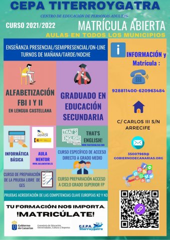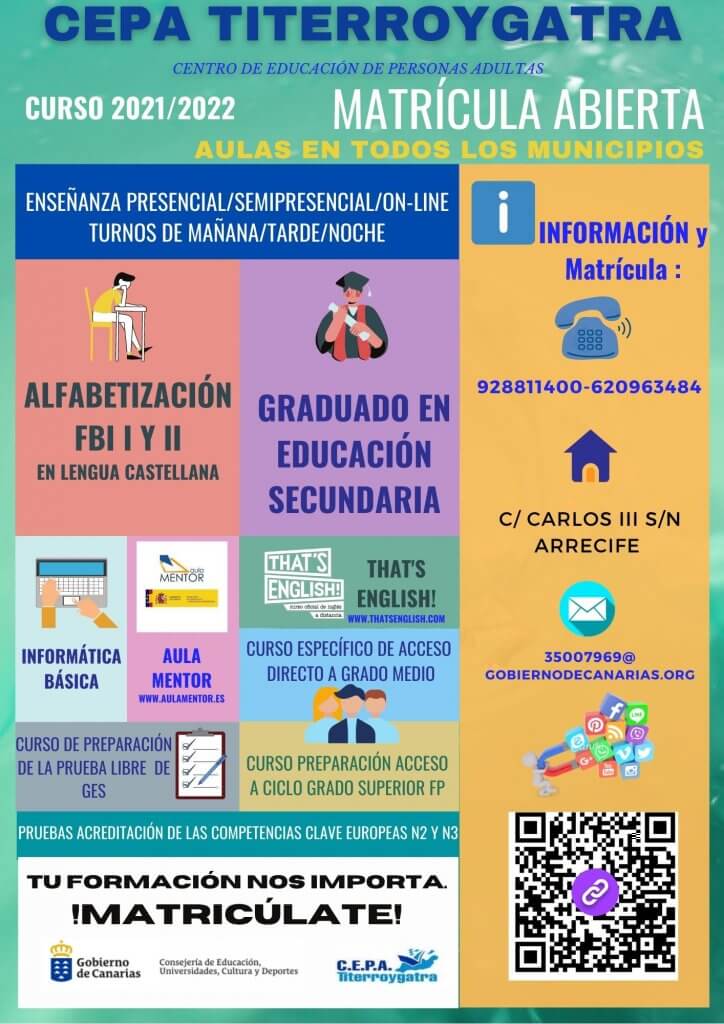 Con septiembre se inicia un nuevo curso y es por ello que desde la concejalía de Educación del Ayuntamiento de San Bartolomé, comunicamos a todas las personas interesadas que permanece abierta la matrícula para las enseñanzas de personas adultas en el C.E.P.A. Titerroygatra.