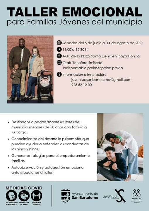 Desde la Concejalía de Juventud del Ayuntamiento de San Bartolomé que dirige Ana María Lopes Da Silva Santos, se informa del Proyecto Taller Emocional para Familias Jóvenes del municipio que se va a ejecutar a partir del próximo 5 de Junio.