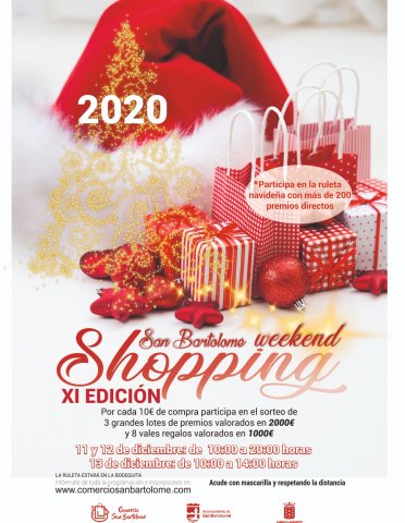 ‘San Bartolomé Shopping Weekend 2020’ cumple este año su undécima edición a desarrollar los días 11, 12 y 13 de diciembre. Este evento vuelve a renovarse en su objetivo de otorgar mayor visibilidad a los comercios y establecimientos del municipio durante tres jornadas en las que se dinamizará a través de un amplio programa de actividades la actividad comercial de la vecindad.