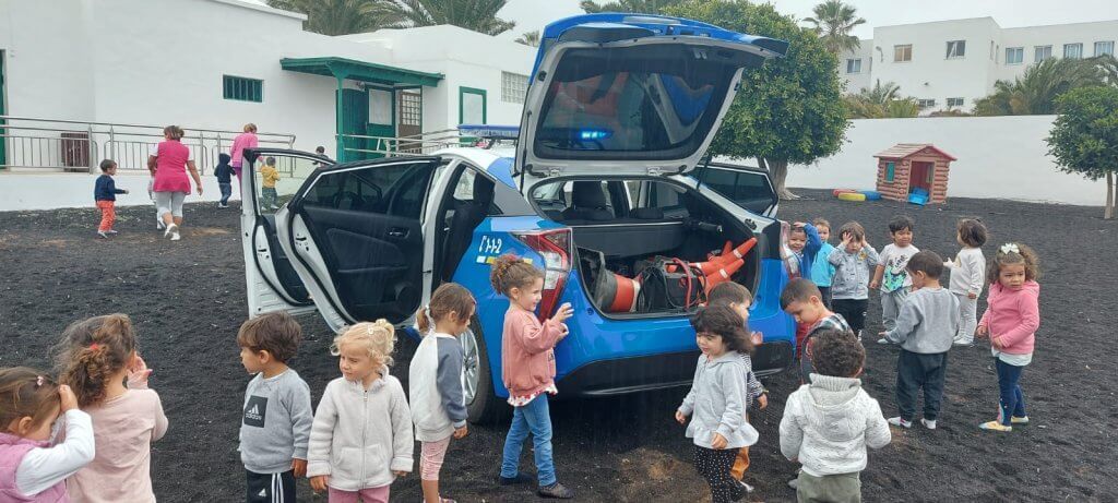 El Policía Local, Marcial Luis Pérez entró el coche patrulla hasta el patio del centro, y enseñó a los niños y niñas varios de los dispositivos utilizados en la labor diaria, como las sirenas.