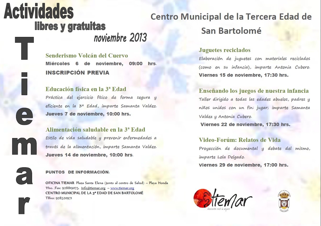 MIÉRCOLES. 18:15 horas. Salón de actos. Centro Cívico de Playa Honda. Imparte Carmela Tambone.