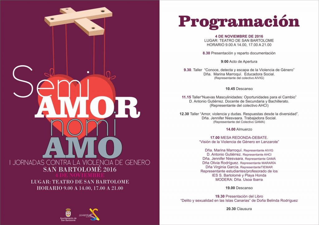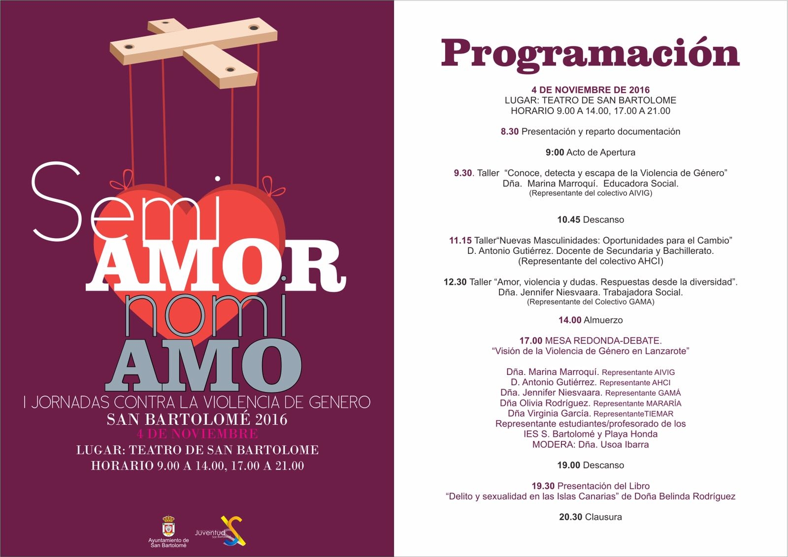 El próximo viernes 4 de noviembre, en el Teatro de San Bartolomé, a las 9.00 horas tendrá lugar el acto de Presentación e Inauguración de la “1ª Jornada contra la Violencia de Género”, cuyo lema es “Sé mi amor, no mi amo”, dirigida a la juventud del municipio teniendo como objetivo sensibilizar y facilitar la adquisición de una identidad personal tolerante y diferenciada para que la convivencia en la sociedad llegue a ser igualitaria y plural.