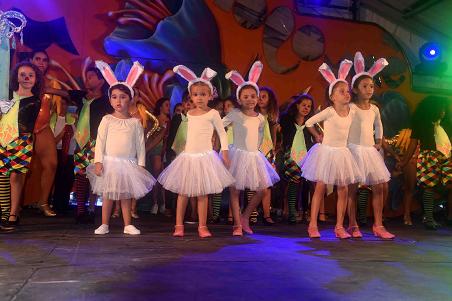 50 niños/as sobre el escenario, con un vestuario perfectamente seleccionado para la ocasión hicieron vibrar al público asistente al acto que llenó al completo el patio de butacas bajo el influjo de mundo circense.