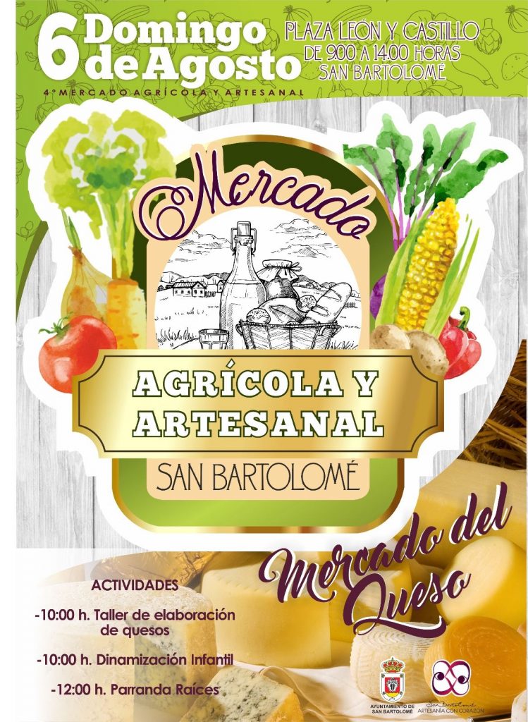 El Ayuntamiento de San Bartolomé informa a toda la ciudadanía que el domingo, día 6 de agosto, de 9.00 a 14.00 horas estará instalado el Mercado de productos agrícolas y artesanales de San Bartolomé, que se viene desarrollando los primeros domingos de cada mes, en la Plaza León y Castillo (delante de la Sociedad El Porvenir), en la localidad de San Bartolomé.