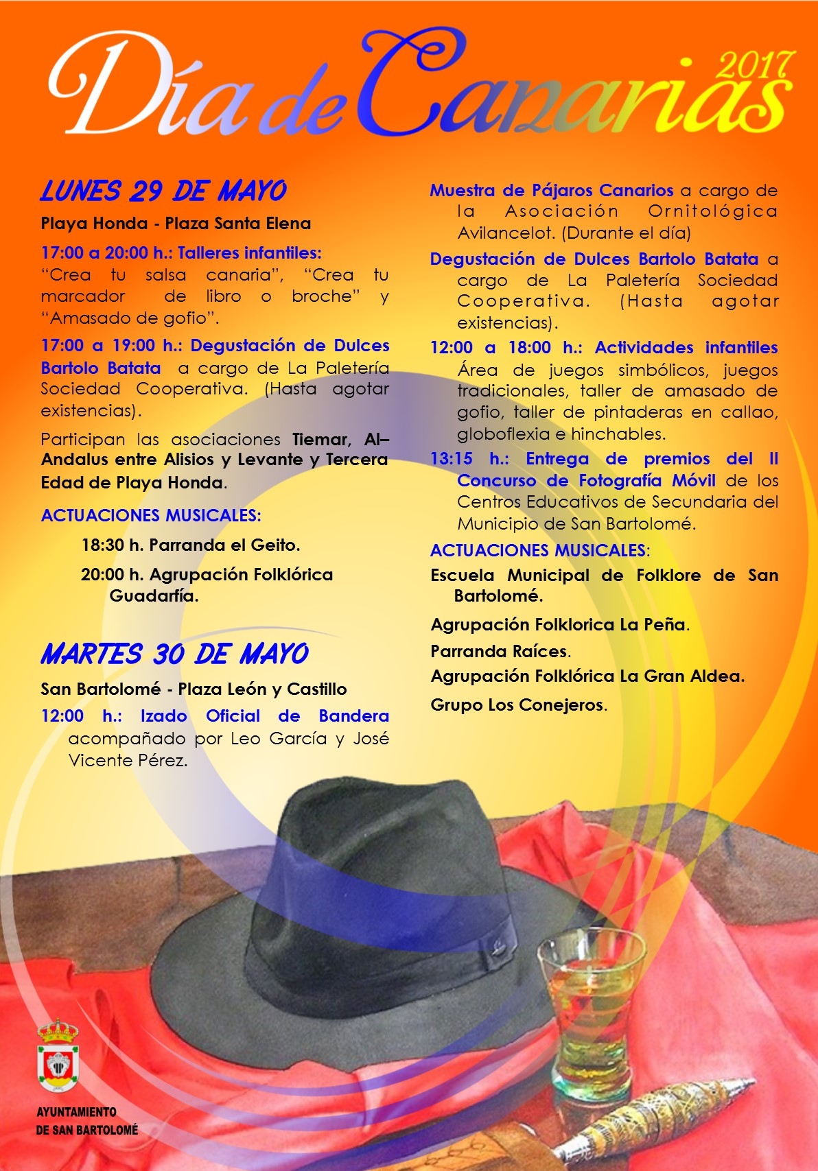 El Día de Canarias en el municipio de San Bartolomé contará con actos repartidos entre Playa Honda y San Bartolomé, los días 29 y 30 de mayo, invitando desde el Ayuntamiento de San Bartolomé a toda la vecindad y visitantes a participar en los actos conmemorativos de este Día Grande para todos/as los canarios/as.