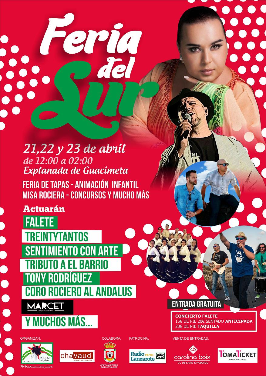 La Feria del Sur, se celebrará del 21 al 23 de abril en la explanada de Guacimeta, organizada por la Asociación Al-Andalus entre Alisios y Levante y Chavaud Producciones, colaborando el Ayuntamiento de San Bartolomé. La Feria del Sur arrancará el 21 de abril a las 21:00 horas y acabará el 23 de abril a las 20:00 horas. Se celebrará en la Explanada de Guacimeta y contará con actuaciones variadas que subirán al escenario a Tributo a “El Barrio”, Sentimiento con arte, el cómico Tony Rodríguez, Coro Rociero Al-Andalus, TreintyTantos, Marcet Dj & Speaker, y Falete con cuadro flamenco.