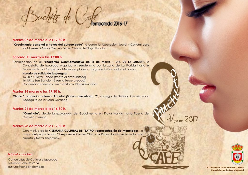 Martes día 7, a las 17:30 horas en el salón de actos del Centro Cívico de Playa Honda. Crecimiento personal a través del autocuidado, a cargo de “la asociación social y cultural para las mujeres Mararía”