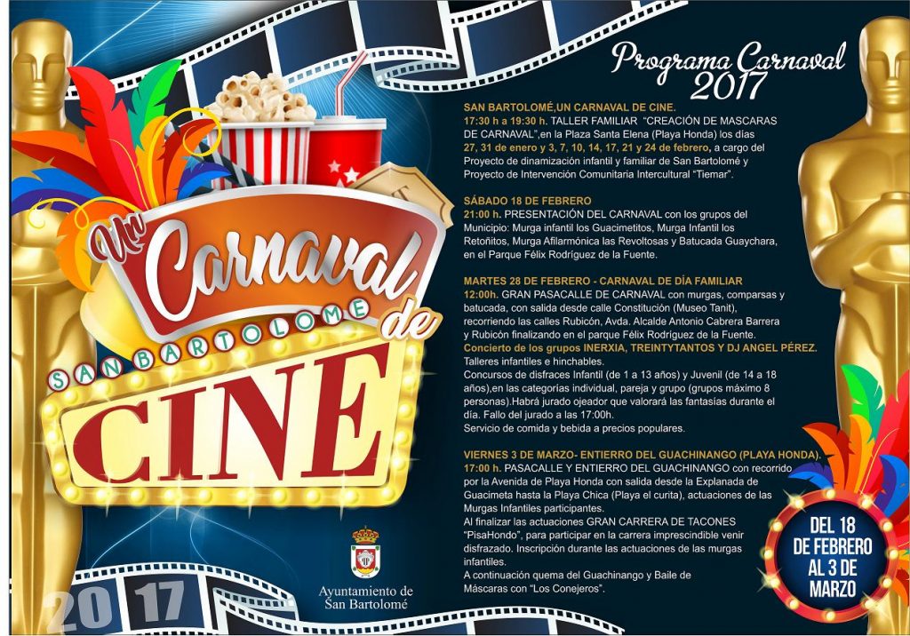 Los actos carnavaleros en el municipio comenzarán con talleres de creación de máscaras de carnaval. En esta edición San Bartolomé gozará con un Carnaval de Cine. Estos festejos vienen con novedades centrándose en la presentación de agrupaciones, el 18 de febrero con la participación de Murga infantil los Guacimetitos, Murga Infantil los Retoñitos, Murga Afilarmónica las Revoltosas y Batucada Guaychara. El Carnaval se traslada al día, el martes 28 de febrero, con gran pasacalle y conciertos de Inerxia, Treintytantos, y DJ Ángel Hernández, talleres, concurso de disfraces infantiles y mucho más. Para concluir los actos, en Playa Honda, con la entierro del Guachinango, pasacalle, carrera de tacones, y baile de máscaras.