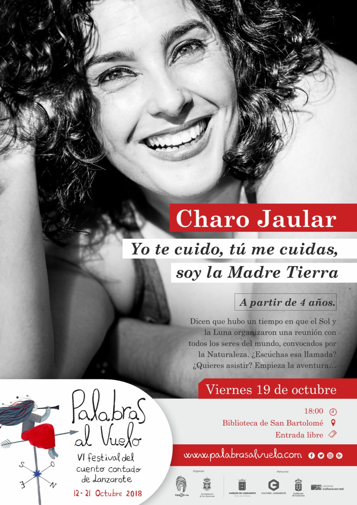Palabras al vuelo llega una edición más, en este caso, cumpliendo ya seis años, con sus “cuentos contados” al municipio, con una propuesta para público infantil y familiar con un cuento “Yo te cuido, tú me cuidas, soy la Madre Tierra”, a cargo de Charo Jaular. ¡No te lo pierdas, disfruta de deliciosas palabras hiladas, formando un buen cuento!