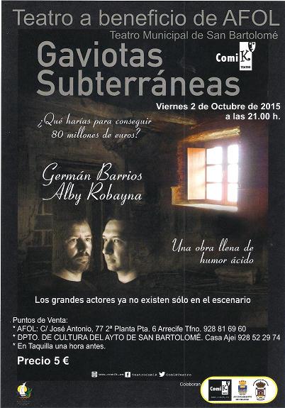 Gaviotas Subterráneas es una pieza llena de intriga y tensión, protagonizada por Germán Barrios y Alby Robayna quienes dan vida a dos amigos con un plan para conseguir 80 millones de euros. Humor ácido, vida y muerte, verdades, mentiras… silencios que serán tan elocuentes como las palabras y que nos ha permitido indagar en las pasiones y en los requisitos más interiores del ser humano.