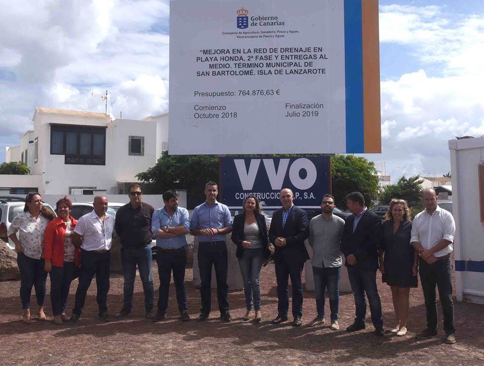 Hoy, a las 12.30 horas han acudido a Playa Honda, que comenzaban las obras de saneamiento y evacuación de aguas pluviales de Playa Honda, la alcaldesa de San Bartolomé, María Dolores Corujo, el Director General de Aguas, Juan Ramón Felipe, destacando la importancia del inicio de estas obras muy necesarias para la localidad de Playa Honda, acompañados también por el concejal de Obras, Alexis Tejera, junto a otros ediles y técnicos de ambas administraciones.