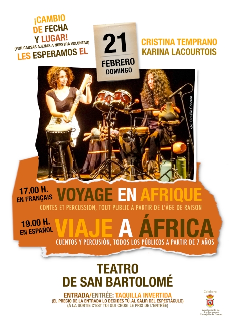 *El espectáculo estaba previsto para el sábado 20 en la Sala Librada por causas ajenas a la voluntad de las artistas y de la sala Librada ha sido necesario cambiar lugar y fecha. El Teatro de San Bartolomé, desde la Concejalía de Cultura, acoge el domingo 21 “Viaje a África” con dos pases, a las 17.00 horas en francés y a las 19.00 horas en castellano.