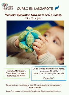 Los días 24 y 25 de julio se llevará a cabo un curso teórico-práctico, con una duración de 10 horas, de “Recursos Montessori para niños de 0 a 3 años”, que se impartirá en la Guardería de Playa Honda, ubicada en la calle Fragata 28 de Playa Honda (junto Centro Cívico). El horario del curso será de 16.00 a 20.00 horas el viernes, 24 de julio, continuando de 10.00 a 14.00 y de 16.00 a 18.00 horas el sábado, 25 de julio.