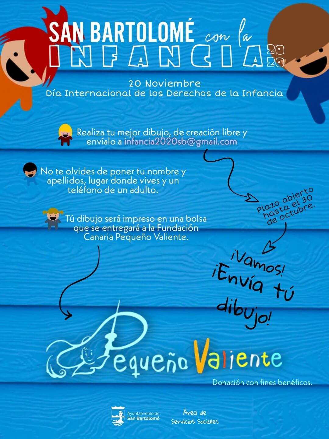 Se solicita desde el Ayuntamiento a todos los niños y niñas que envíen sus dibujos sobre la infancia al correo electrónico infancia2020sb@gmail, desde el 9 de octubre y hasta el 30 de octubre, poniendo el nombre, apellidos, edad, y contacto y teléfono de un adulto. El Ayuntamiento utilizará cada uno de los dibujos recibidos para crear una mochila solidaria de color azul que es el color conmemorativo del Día internacional de la Infancia.