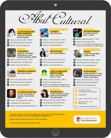 La programación continúa con actos para todos los públicos. Podrán ir accediendo a todas las actividades de forma gratuita, con inscripción previa, bien en www.ecoentradas.com; o bien en diferentes actividades en las que se podrán retirar invitaciones en el correo concejaliadecuturasb@gmail.com, cumpliendo con las estrictas medidas sanitarias de aforo y prevención establecidas por las autoridades sanitarias.Actos detallados previstos