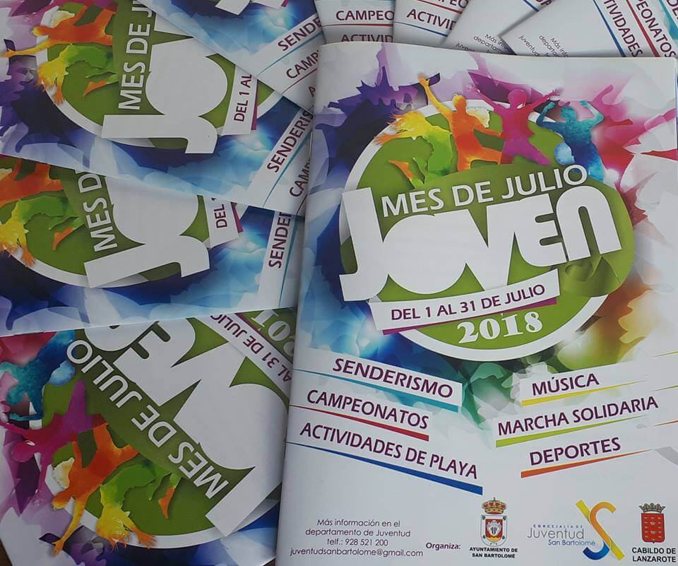 JULIO JOVEN en San Bartolomé, cumple su tercer año consecutivo ofreciendo ocio y actividades de tiempo libre joven en verano. Con una programación variada que abarca música, campeonatos, deportes, marcha solidaria, senderismo, actividades de playa, lúdicas y culturales y mucho más desde el 1 al 31 de julio, se organiza este programa destinado a vecindad entre 12 y 35 años del municipio, teniendo como objetivo generar puntos de encuentro juveniles y crear nuevos vínculos de relación entre los chicos y chicas de las distintas localidades del municipio, que confluirán en la distinta programación organizada.