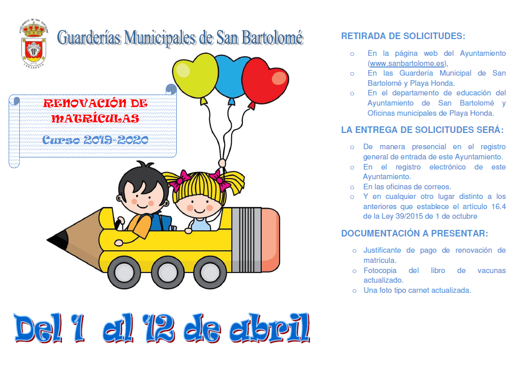 El Ayuntamiento de San Bartolomé a través de la concejalía de educación informa que está abierto el plazo para la presentación de solicitud de renovación y nueva inscripción en las Guarderías Municipales de San Bartolomé y Playa Honda para el curso 2019/2020.