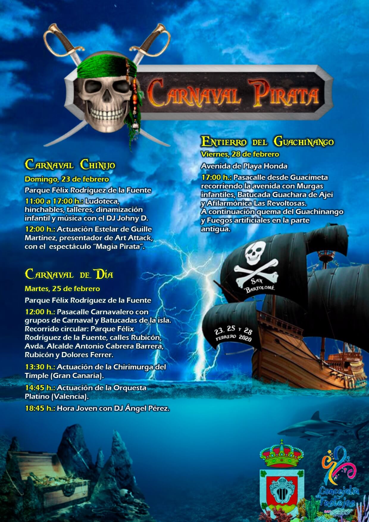 El Ayuntamiento de San Bartolomé dedicará el Carnaval a la fantasía “Pirata” y los actos estarán centrados en tres días, para conmemorar las carnestolendas en el municipio, invitando el alcalde, Alexis Tejera y el concejal de festejos, Isidro Pérez, a toda la vecindad a disfrazarse, maquillarse y salir a disfrutarlo con amistades, familiares, vecindad y visitantes, participando en la programación prevista.