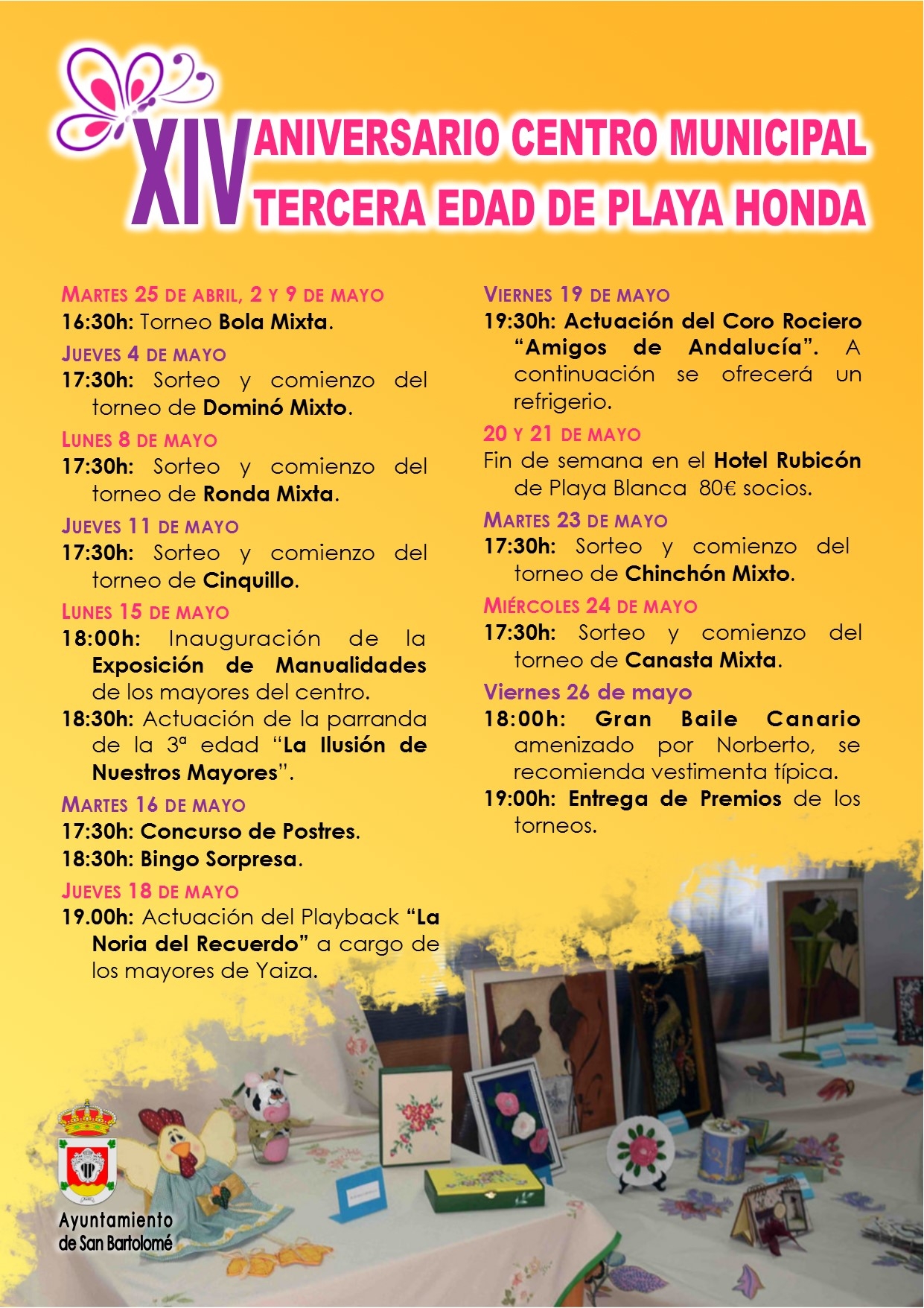 Con una variada programación los mayores disfrutarán de actos desde el 15 de mayo hasta el 26, que concluirán los festejos conmemorativos de los catorce años de existencia del Centro. Este programa está organizado por la Asociación de la Tercera Edad Santa Elena de Playa Honda en colaboración con la concejalía de Bienestar Social del Ayuntamiento de San Bartolomé.