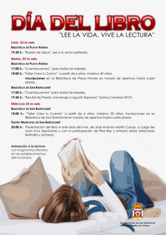 El Ayuntamiento de San Bartolomé invita a participar en los actos organizados con los que se celebrará el Día Internacional del Libro, con el deseo de que cada vez más personas se apasionen por la lectura. Lee la vida, vive la lectura.