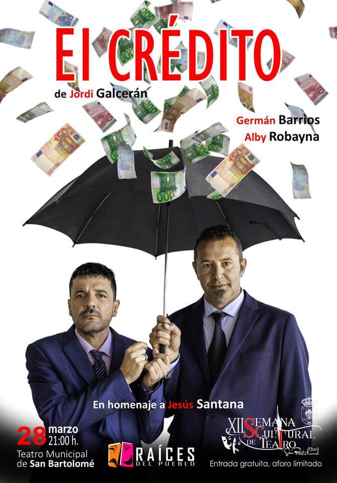 La XII Semana Cultural de Teatro de San Bartolomé, organizada por la concejalía de cultura del Ayuntamiento de San Bartolomé, contará entre su amplia agenda teatral con la representación de la comedia ‘El Crédito’, a cargo de la ‘Compañía Teatral Raíces del pueblo’, el jueves, día 28 de marzo, a las 21.00 horas en el Teatro de San Bartolomé, con entrada gratuita y aforo limitado. Esta obra se representa en homenaje a Jesús Santana, recientemente fallecido de forma inesperada. Santana, iba a representar uno de los dos papeles de esta obra junto a Germán Barrios, por lo que Raíces del Pueblo ha querido seguir adelante, en su memoria, con este estreno se rinde homenaje dedicados al mundo del humor, comedia y sobre escenarios de Jesús Santana, polifacético profesional.