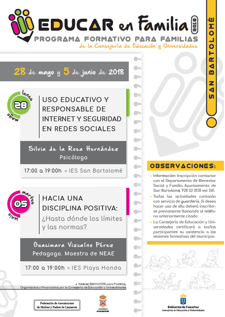 El próximo martes, 5 de junio, el programa Educar en Familia dirigido a madres y padres de la comunidad educativa del municipio, está organizado en colaboración por la concejalía de bienestar del Ayuntamiento de San Bartolomé y la consejería de educación y universidades de Gobierno de Canarias.