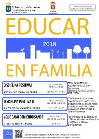 El Ayuntamiento de San Bartolomé informa a todos los interesados a través de la concejalía de bienestar social que el lunes, día 6 de mayo concluirá el Programa Educar en Familia 2018/2019, con el taller denominado “¿Qué gano comiendo sano?”, que se desarrollará en el CEIP Ajei de 18:00 a 20:00 horas, de mano del pediatra Vicente Román Peris, que informará sobre cómo ayudar a establecer hábitos alimentarios saludables en nuestro día a día, y entender como beneficia y ayuda tener una vida mucho más sana, sobre todo para los más pequeños de la casa.