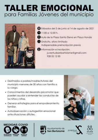 Desde la Concejalía de Juventud del Ayuntamiento de San Bartolomé que dirige Ana María Lopes Da Silva Santos, se informa del Proyecto Taller Emocional para Familias Jóvenes del municipio que se va a ejecutar a partir del próximo 5 de Junio.Este Taller Emocional, está destinado para madres, padres o tutores legales, del municipio de San Bartolomé, con edad inferior a 30 años y que tengan hijos/as a su cargo.