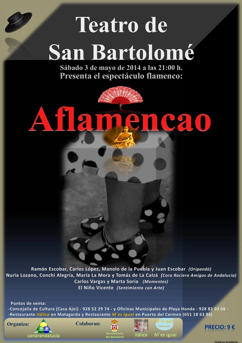 El sábado, 3 de mayo, a las 21:00 horas, el Teatro Municipal de San Bartolomé, acogerá el Espectáculo “Aflamencao”, con las actuaciones de Ramón Escobar, Carlos López, Manolo de la Puebla y Juan Escobar (Oripandó), Nuria Lozano, Conchi Alegría, María la Mora y Tomás de la Calzá (Coro Rociero Amigos de Andalucía), Carlos Vargas y Marta Soria (Momentos), y el Niño Vicente (Sentimiento con arte).