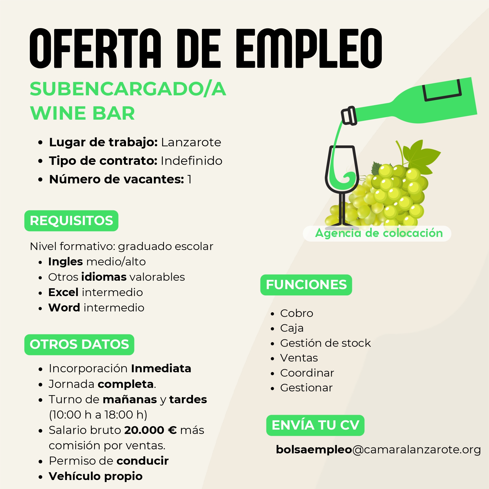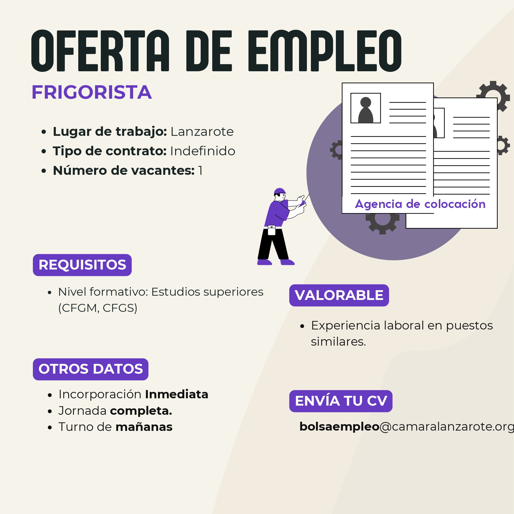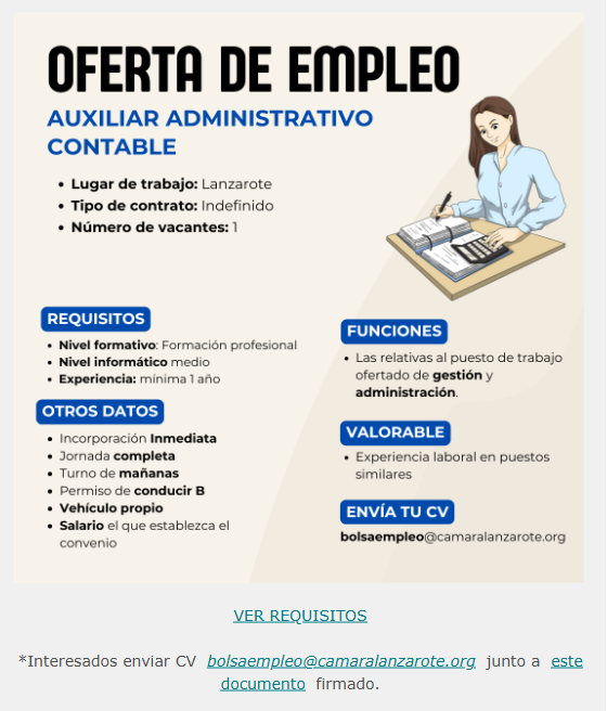 AUXILIAR ADMINISTRATIVO CONTABLE Arrecife , LAS PALMAS 12/3/2025 Descripción Vacantes 1 Lugar Arrecife , LAS PALMAS Tipo de jornada Jornada Completa Tipo de contrato…