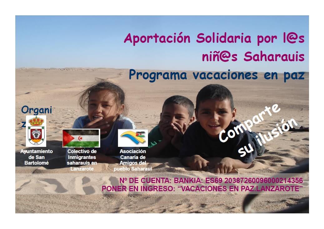 Para este encuentro del próximo Sábado, los dos colectivos antes reseñados solicitan la colaboración económica solidaria del pueblo de Lanzarote para costear los gastos de transporte de los 3 niñ@s saharauis de Lanzarote a Tinduf, además de conseguir más aportaciones económicas para intentar traer más niñ@s saharauis el próximo verano en el programa VACACIONES EN PAZ 2019. Para ello comunican al pueblo conejero el número de cuenta de la asociación: BANKIA: ES69 20387260096000214356 ( Ver archivo adjunto ) y ruegan hagan un DONATIVO SOLIDARIO, reflejando en el ingreso : “ VACACIONES EN PAZ LANZAROTE “.