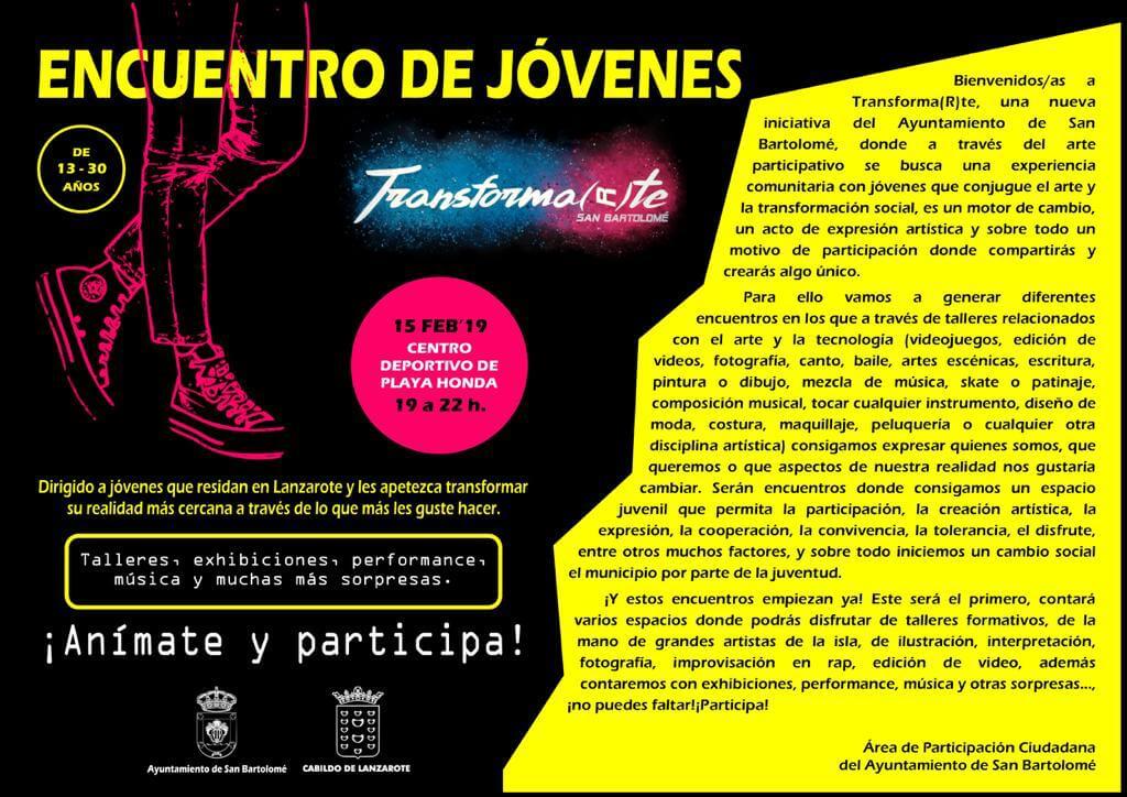 Participa en el I Encuentro de Jóvenes Transformarte San Bartolomé, para jóvenes de 13 a 30 años (talleres, exhibiciones, performance, música y muchas más sorpresas), organizado desde la concejalía de Participación Ciudadana del Ayuntamiento de San Bartolomé que dirige María Dolores Fernández, en colaboración con el Cabildo de Lanzarote.