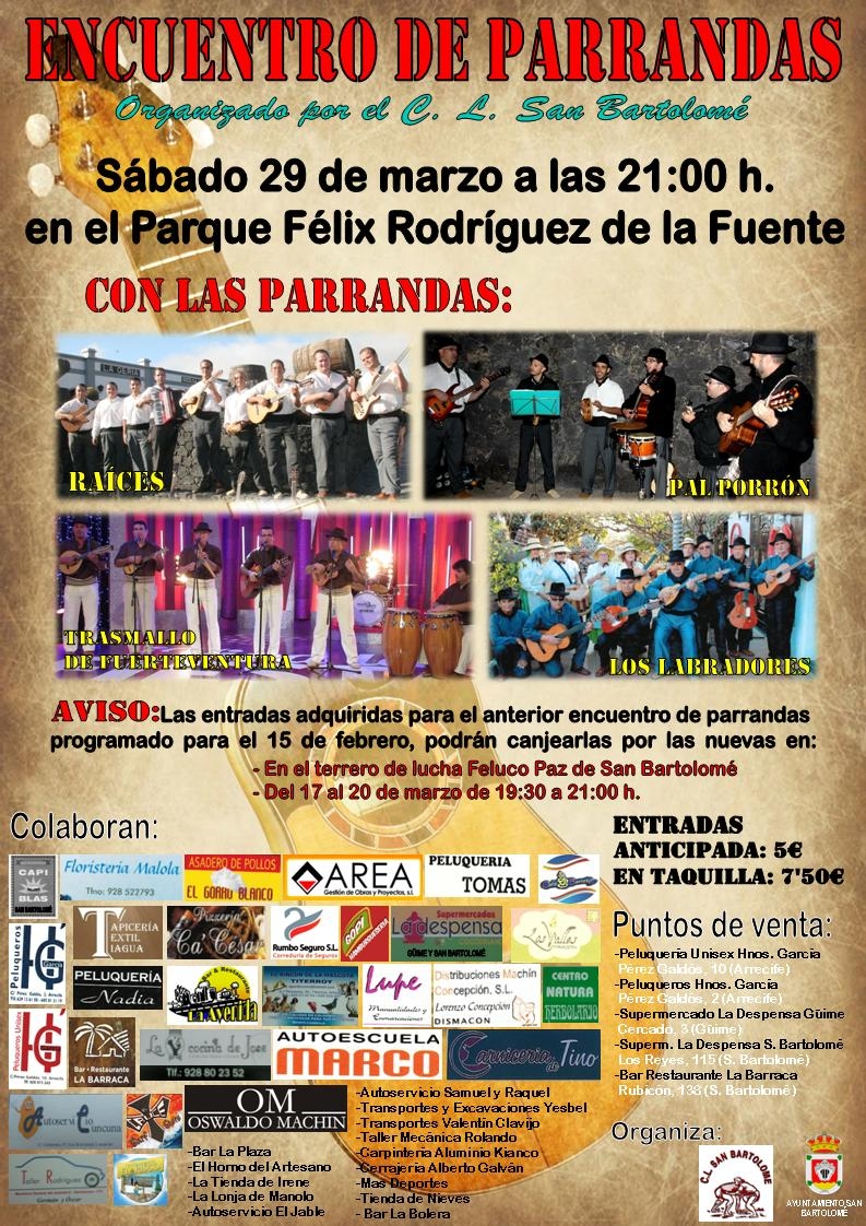 El sábado 29 de marzo a las 21.00 horas, el Parque Félix Rodríguez de la Fuente acogerá el Encuentro de Parrandas, organizado por el Club de Lucha San Bartolomé en colaboración con el Ayuntamiento de San Bartolomé, en el que actuarán las parrandas Raíces, Pal’ Porrón, Trasmallo de Fuerteventura y Los Labradores.