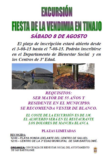 El sábado 8 de agosto, los mayores del municipio podrán participar en la excursión que se realizará a la “Fiesta de la vendimia de la localidad de Tinajo”.