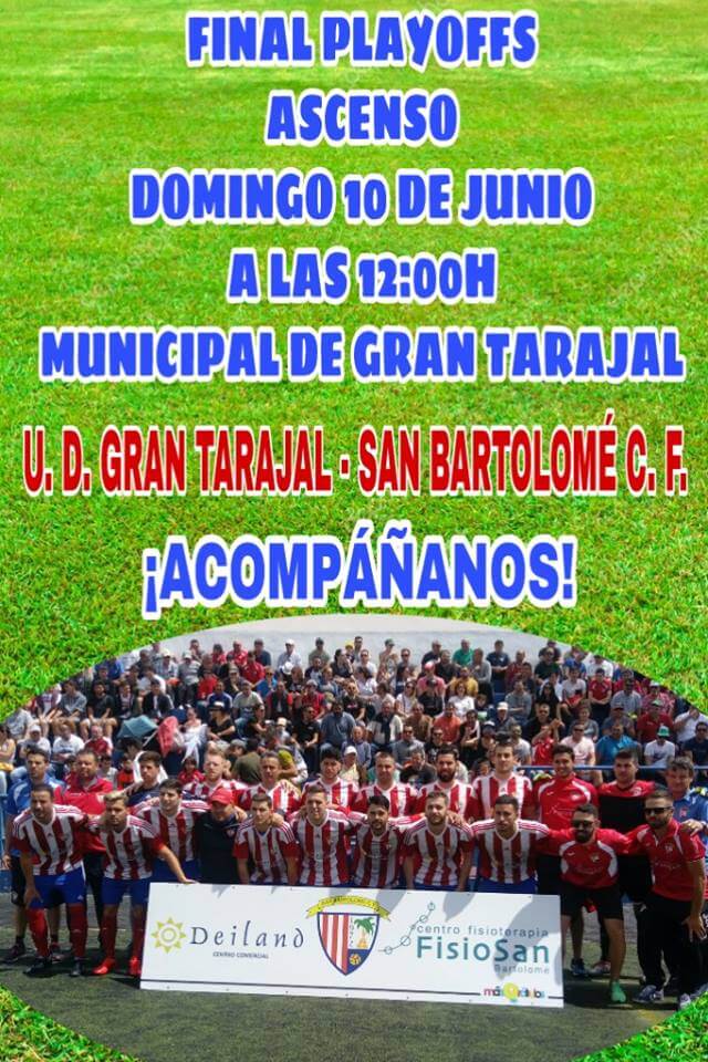 El San Bartolomé C.F. anima a toda la afición a sumarse al Partido que se disputará contra el U.D. Gran Tarajal en Fuerteventura, el domingo 10 de junio, acompañando al equipo en esta remontada, final playoffs, ascenso.
