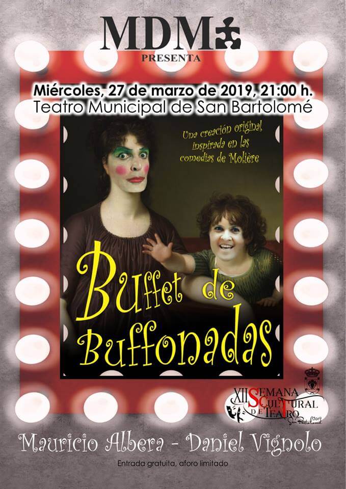 Hoy 27 de marzo el Teatro de San Bartolomé acogerá la representación teatral de ’Buffet de Bufonadas’ a cargo de ‘MDM Producciones’ dentro de la XII Semana Cultural de Teatro de San Bartolomé.
