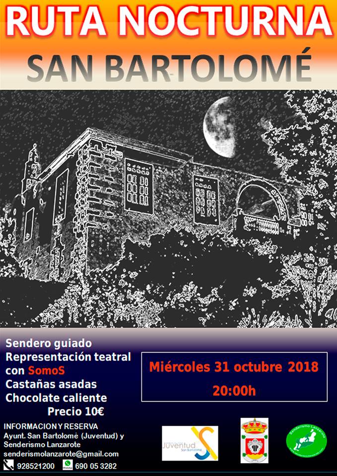 Coincidiendo con la noche previa a la celebración del día de “Todos Los Santos”, se organiza una actividad desde la concejalía de juventud del Ayuntamiento de San Bartolomé, delegada en Isabel Sosa, que consistirá en ruta de senderismo por el casco de San Bartolomé, que incluye escenificación teatral a cargo de SomoS, para la noche del 31 de octubre, con salida a partir de las 20.00 horas desde la Casa Mayor Guerra y regreso al mismo punto.