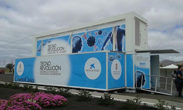 • Mover una bola con el poder de la mente, adivinar mediante un ordenador cómo se propaga un virus y se produce una pandemia, ver cómo un mini-robot lleva un medicamento a un punto concreto de nuestro cuerpo. Éstas son tan sólo algunas aplicaciones de las tecnologías convergentes que podrán ver los visitantes de Tecnorrevolución, una exposición organizada por la Obra Social “la Caixa” y el Ayuntamiento de San Bartolomé, podrá visitarse en el camión instalado en el Parking de la Explanada de Guacimeta/ Playa Honda, del 2 al 19 de julio de 2015.