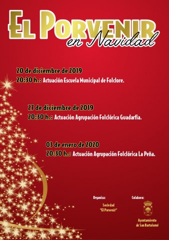 La Sociedad El Porvenir de San Bartolomé invita a toda la vecindad y visitantes a disfrutar de los conciertos para estos festejos navideños, que se celebrarán en sus instalaciones. Hoy, viernes, 20 de diciembre a las 20.30 horas tendrá lugar la actuación de la Escuela Municipal de Folclore. El viernes, día 27 de diciembre a las 20.30 horas, actuará la Agrupación Folclórica Guadarfía, y comenzando el año, con folclore, el viernes, día 3 de enero, actuación de la Agrupación Folclórica La Peña.Organiza: Sociedad El Porvenir y colabora el Ayuntamiento de San Bartolomé.