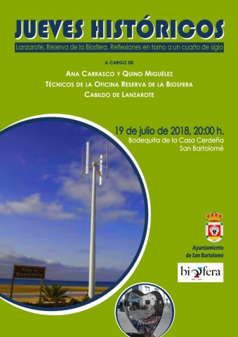El jueves, día 19 de julio, dentro de los “Jueves Históricos”, organizados por la concejalía de patrimonio del Ayuntamiento de San Bartolomé delegada en María Dolores Fernández, a las 20.00 horas se celebrará en la Casa Cerdeña la charla “Lanzarote. Reserva de la Biosfera, Reflexiones en torno a un cuarto de siglo” a cargo de Ana Carrasco y Quino Miguélez, técnicos de la Oficina Reserva de la Biosfera del Cabildo de Lanzarote.