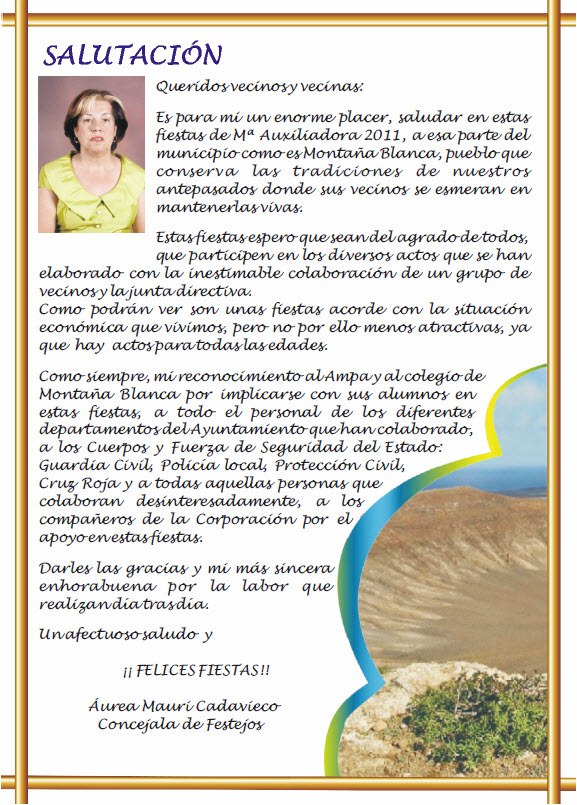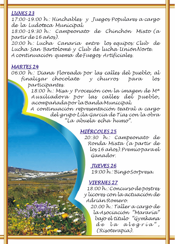 El calendario de las festividades municipales, que se extenderán hasta finalizar el verano, en cada uno de los pueblos del municipio, dará comienzo el viernes día 20 de mayo en la localidad de Montaña Blanca, con las Fiestas en honor a María Auxiliadora.
