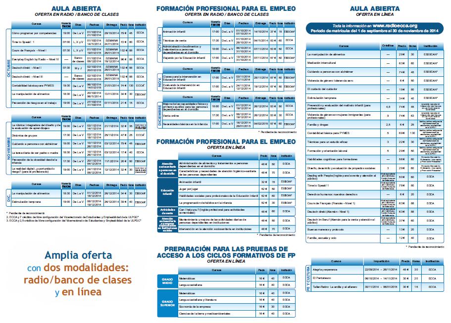 Radio ECCA ha iniciado el curso 2014-2015 con el objetivo de que ninguna persona adulta carezca de titulación oficial. La oferta formativa de Radio ECCA, cuya matrícula está abierta desde septiembre, presenta 410 acciones formativas orientadas y adaptadas a las circunstancias y necesidades actuales de formación para el empleo, entre las que destacan las titulaciones oficiales de Graduado en Educación Secundaria y Bachillerato.