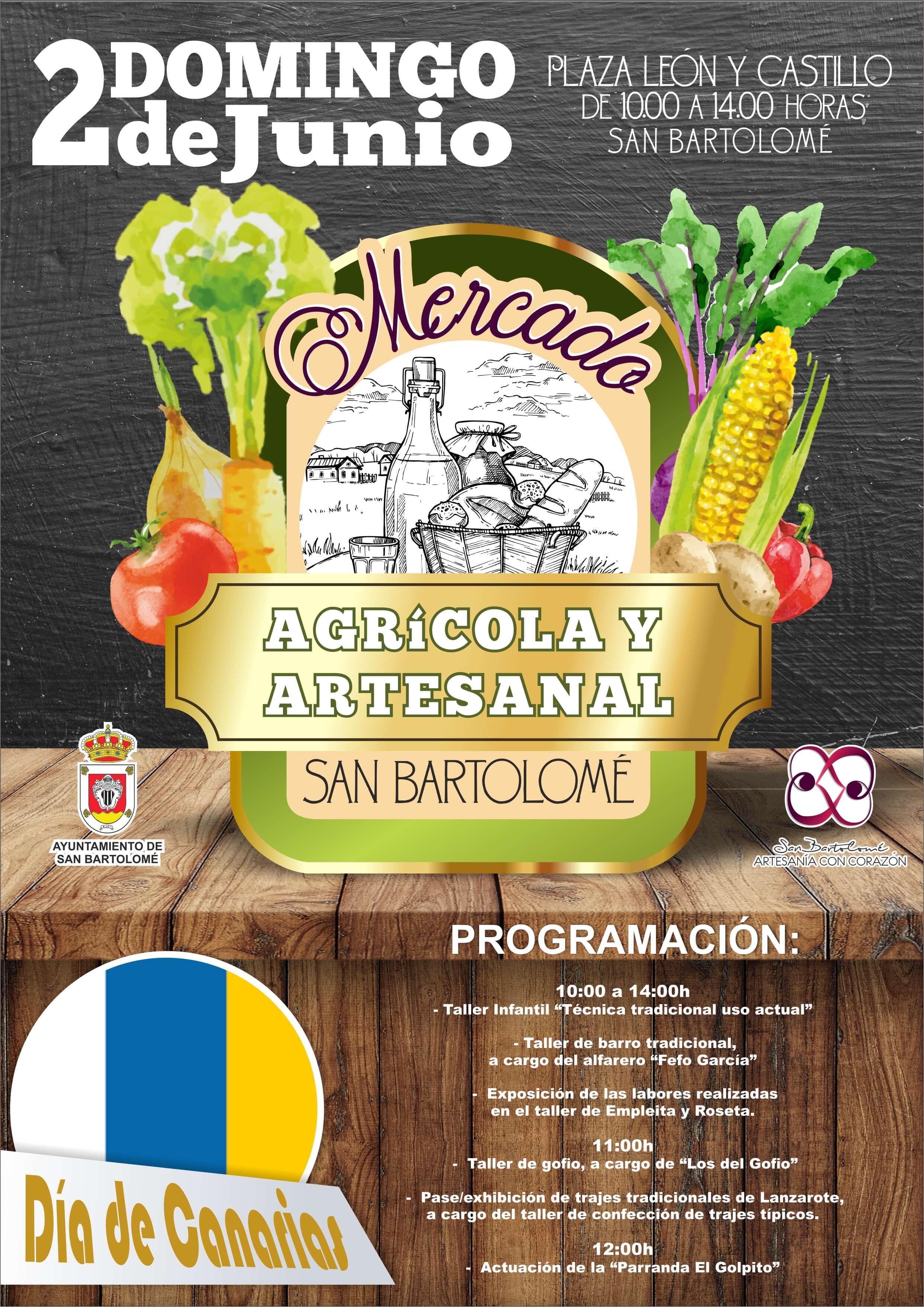 Las áreas de Agricultura y Artesanía del Ayuntamiento de San Bartolomé informan que el domingo 2 de Junio se celebrará el Mercado Agrícola y Artesanal de San Bartolomé. En esta ocasión, estará dedicado al “DÍA DE CANARIAS”. Ofreciendo las siguientes actividades :