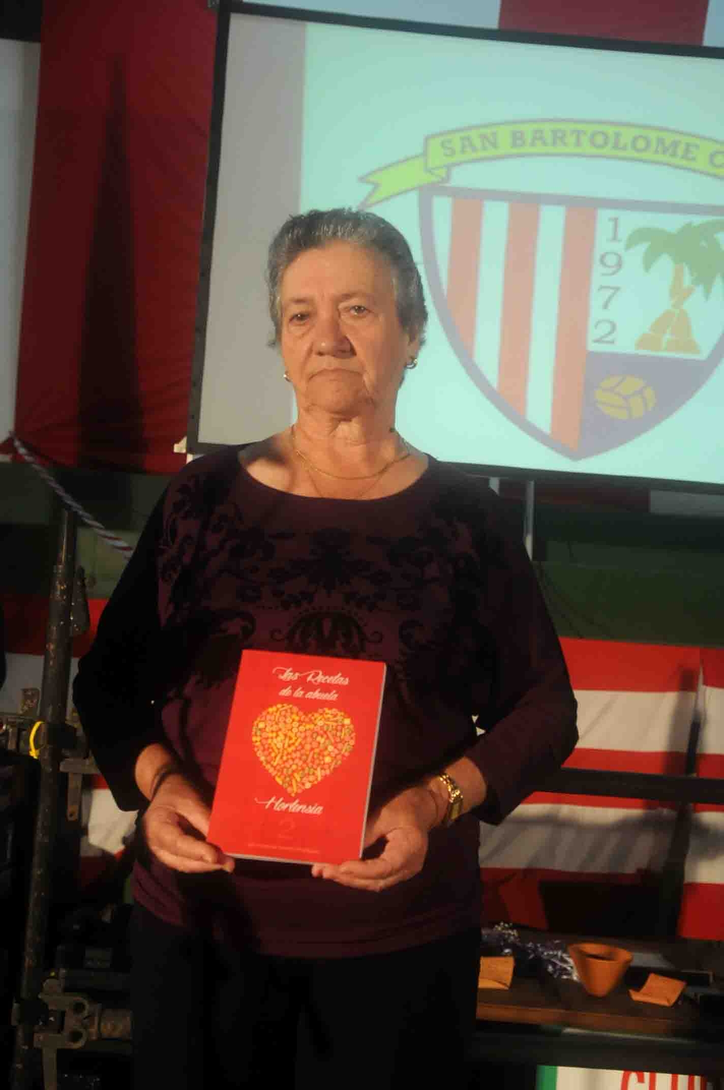 El libro “Recetas de la Abuela de la abuela Hortensia II” se presentó en el transcurso del acto, agradeciendo Hortensia a todas las personas que impulsaron que este libro viera la luz, y a los jugadores del San Bartolomé C.F., que serán los beneficiarios del dinero que se recaude con su venta, por una cuantía de 10€ por ejemplar.  Los libros están a la venta, en las instalaciones del Campo de Fútbol de San Bartolomé, por las tardes a partir de las 17.00 horas.